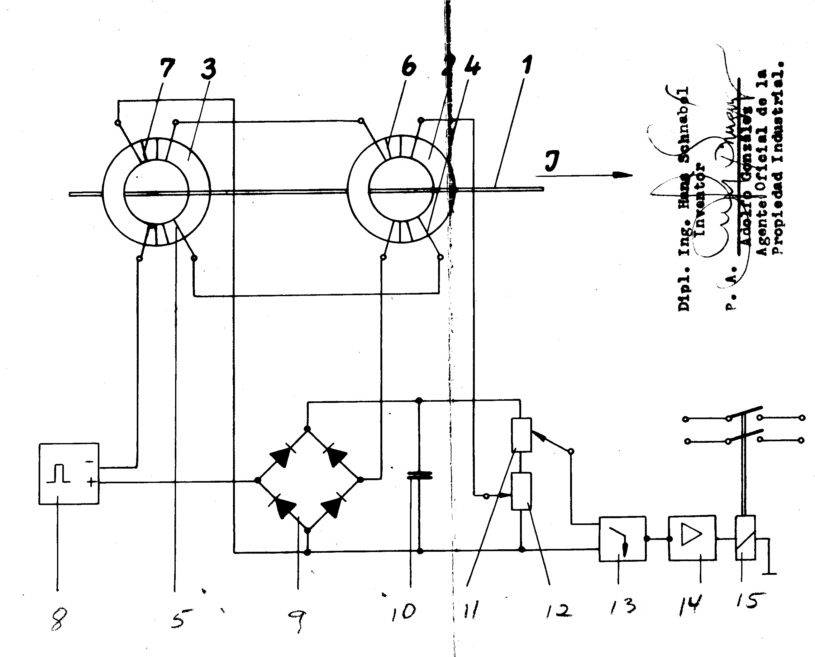 Sistema para control de corriente directas, especialmente para instalaciones para carga de acumuladores, consistente en uno o más núcleos de imán, de material ferromagnético, con un enrollado de entrada que atraviesa la corriente controlada, de un enrollado de imantación que va conectado, por la entrada de voltaje alterno de un puente rectificador en acoplamiento de Graetz, con la salida de un generador de impulsos, y de un enrollado de acoplamiento de reacción que, mediante una resistencia graduable, va conectado con la salida de voltaje directo del puente Graez y rectificador caracterizado, de este modo, porque el generador de impulsos es en sí un generador de onda rectangular porque los enrollados de acoplamiento de reacción están montados de tal modo que su flujo magnético tiene el mismo sentido que el del conductor de corriente directa, y porque como indicador de voltaje se utiliza uno Schmitt-Trigger.